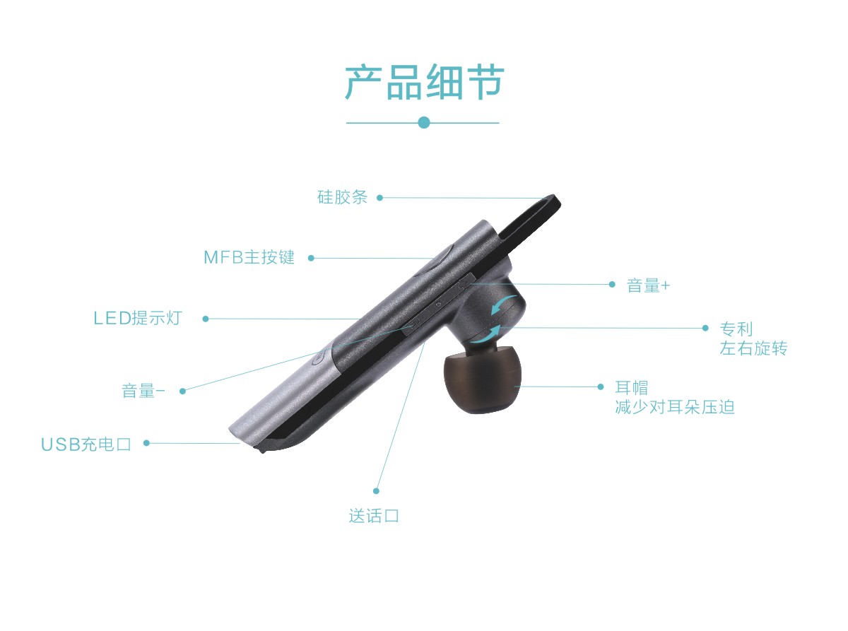 长按MFB键约4秒,白灯闪烁3次后红白灯双闪,听筒有“开机准备配对”提示音,手机蓝牙版本低于V2.1的需输入0000配对密码约180秒配对超时深度睡眠约6分钟后耳机自动关机