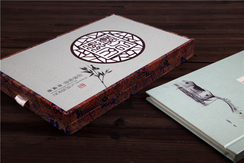 本书在材质和设计上也颇具匠心,首先,书籍选用了极具江南韵味的传统名贵丝绸为主材质,色泽温雅、手感细腻、高贵典雅。其次,该书在设计细节上均时时处处无不展现着苏州的风韵,粉墙黛瓦、小桥流水的笔墨痕迹随处可见,却又不觉刻意,隽秀典雅的包装上,还别出心裁得将主标题设计成一枚精心篆刻的印章,当中成为印章笔画的亭台寺院更是点睛之笔。值得一提的是,其包装的纹样还采用了苏州特有的宋锦作为纹饰,不仅使整体视觉上展现出古色古香的韵味,更将古城、古风、古韵融为一体,使之成了一件独具江南苏州特色的丝绸艺术珍品。