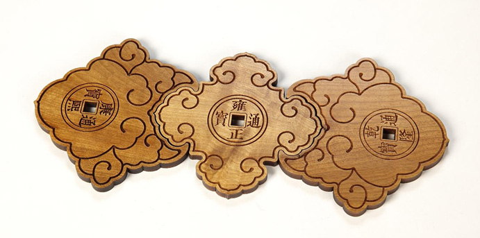 造型灵感来源于传统服饰云肩和四合如意图样。将楠木镂空裁切,杯垫可分可合。兼具实用性和观赏性。