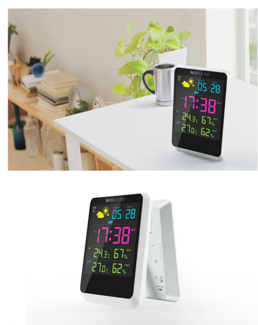 .采集室内外温湿度变化趋势预测晴天/多云/雨/阴天四种天气状态.室内、外机温湿度无线接收与发射(空旷距离大于30米). 12小时或24小时制式选择。