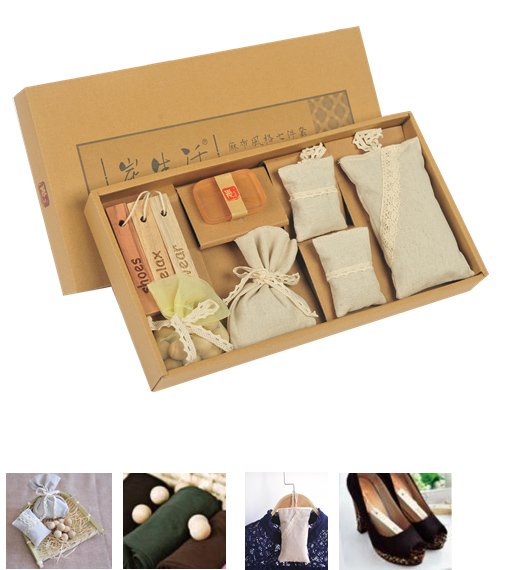 产品组合:炭包*3、樟木条*3、樟木球*12、竹醋香皂