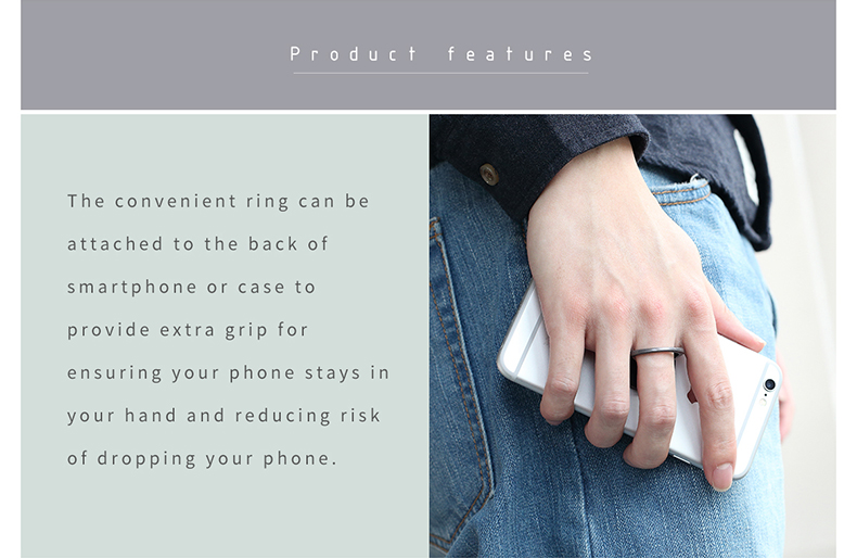 指环底座360°旋转,方便调整舒适的手持角度 金属指环90°旋转,变身手机支架,支撑牢固 时尚外观设计,一体式造型,轻薄新颖 采用新型强力胶体,粘贴牢固,不留痕迹,净水清洗,反复使用。