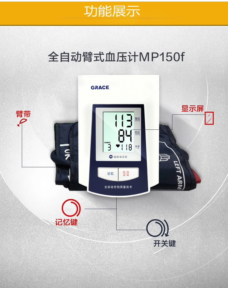 上臂式全自动血压计,高精准,与水银血压计做静态对比实验,误差几乎为0,90个记忆,带心率提示。