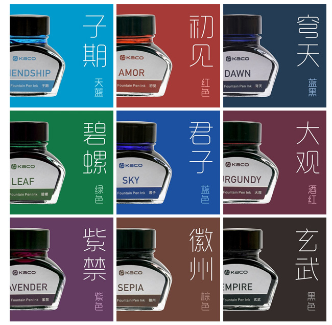 奥地利原装进口KACO彩色钢笔墨水 非碳素配方带来流畅书写,不易堵塞,不伤笔,适用于各类高级书写工具染料型墨水,颜色清丽灵秀,墨香古韵萃聚九色之中,传承中西文化之大美。